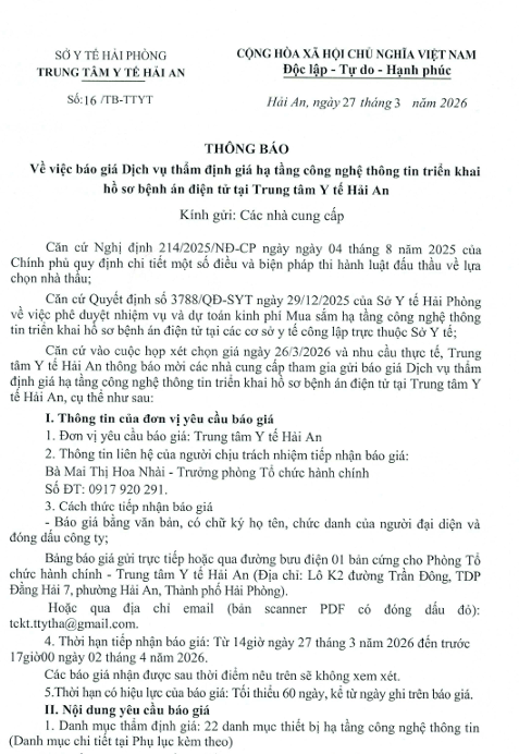 Thông báo về việc báo giá dịch vụ thẩm định giá hạ tầng công nghệ thông tin triển khai hồ sơ bệnh án điện tử tại TTYT Hải An