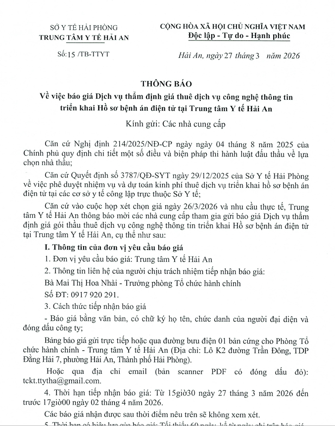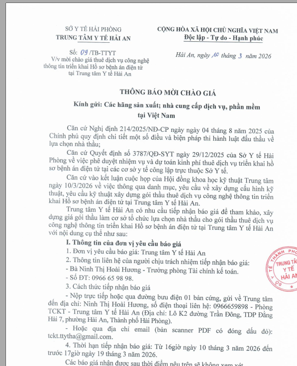 Thông báo về việc báo giá dịch vụ thẩm định thuê dịch vụ công nghệ thông tin triển khai hồ sơ bệnh án điện tử tại TTYT Hải An